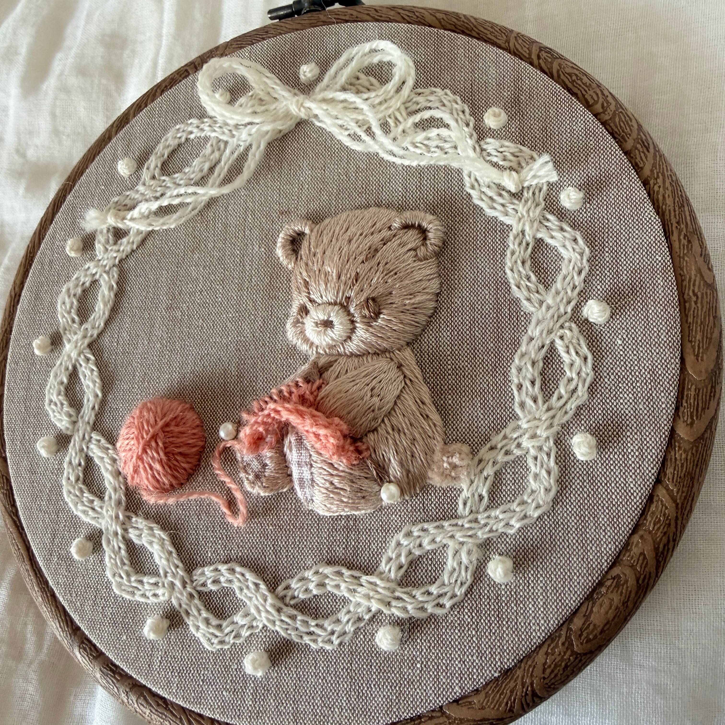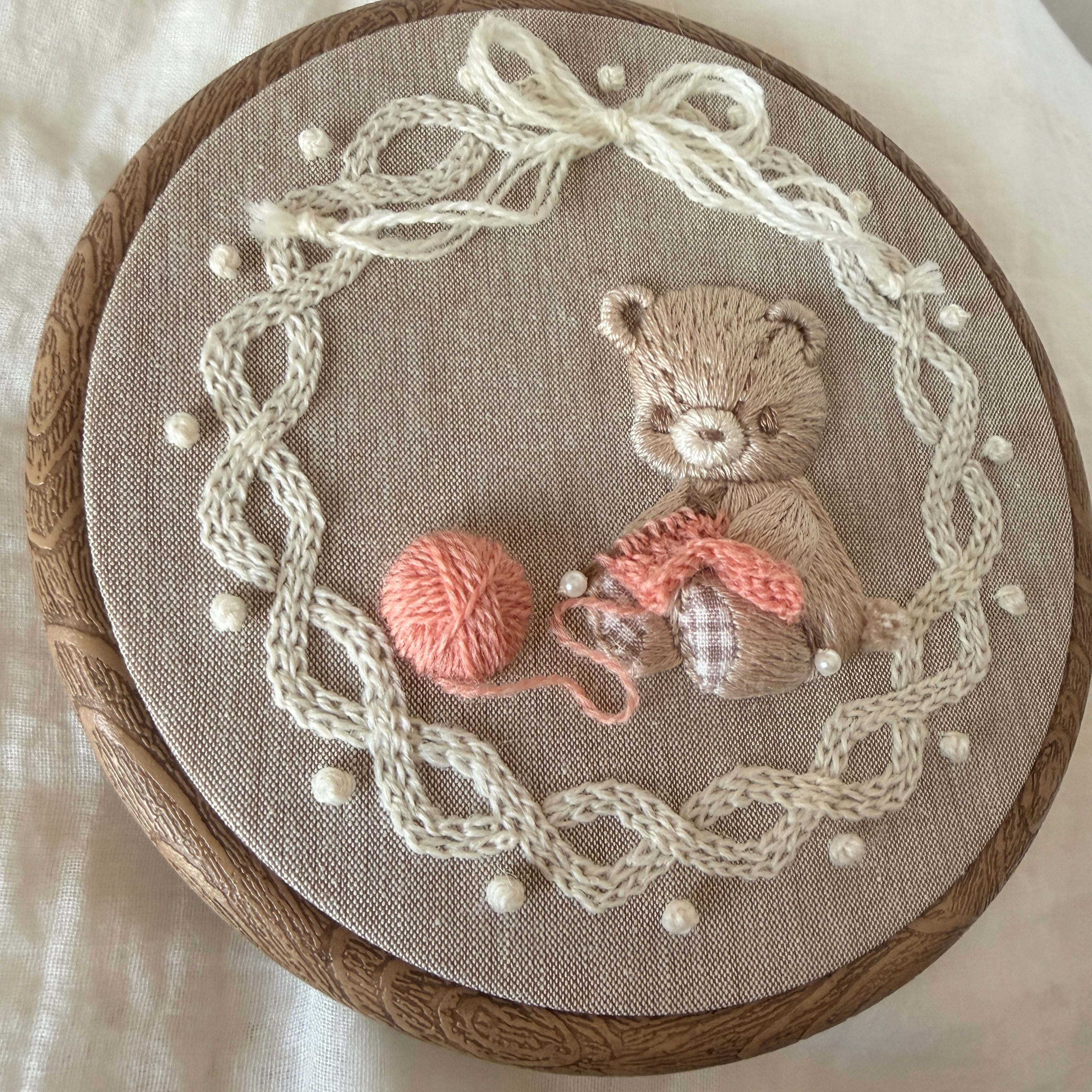 初めて編み物をするくまちゃんを立体刺繍でぷっくりと表現した刺繍プレートです。