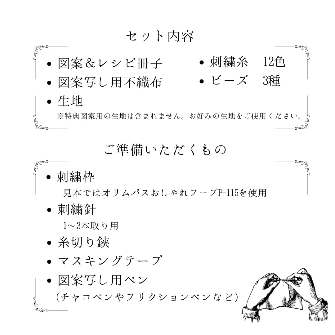 図案写しなどの刺繍の基本や各ステッチの刺し方は本セットには記載しておりません。