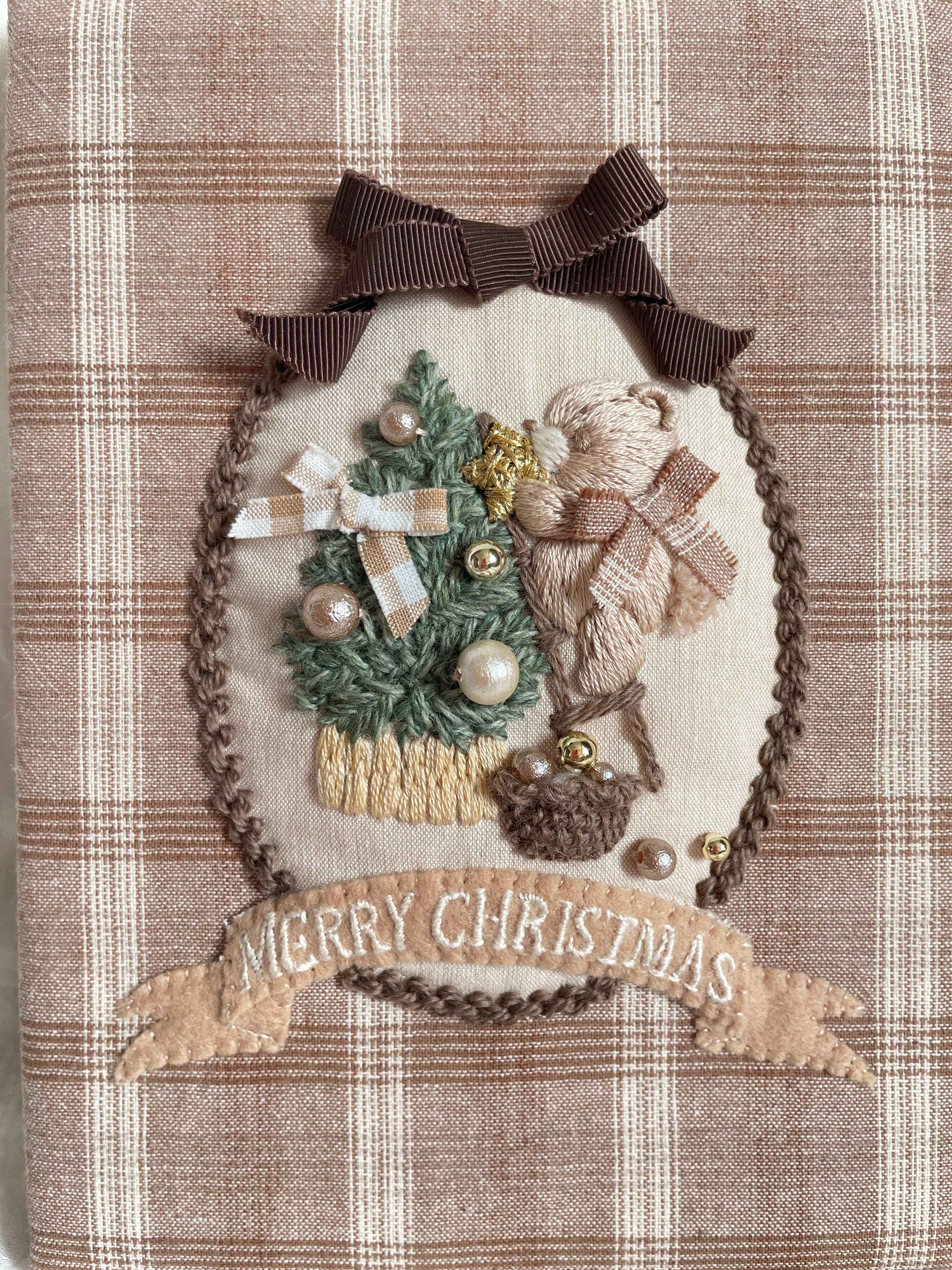 クリスマスツリーの飾り付けをするくまちゃんをぷっくりと刺繍し、洋書風のパネルに仕立てました。